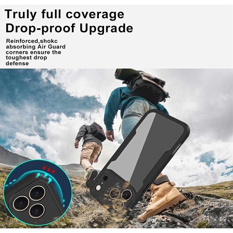 En kombinasjon av TPU-kanter og plastrygg beskytter mot fall, støt, riper og smuss, mens den fremre PET-skjermbeskytteren beskytter skjermen. Hevede kanter rundt kameraet beskytter kameralinsene i tillegg.