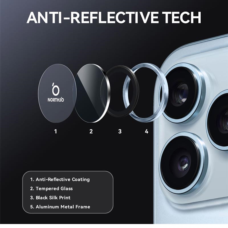 Oppgrader din iPhone 17 Pro, iPhone 17 Pro Max med Northjo kameralinsebeskytter. Med en aluminiumsring med CD-nerver gir den en elegant, moderne touch til din iPhone 17 Pro, iPhone 17 Pro Max, samtidig som den gir robust beskyttelse. Det 9H herdede glasset beskytter mot riper, støt og støv, og sørger for at kameralinsen forblir krystallklar. Med enkel, verktøyfri montering kan du forbedre holdbarheten og estetikken til din iPhone 17 Pro, iPhone 17 Pro Max på få sekunder.