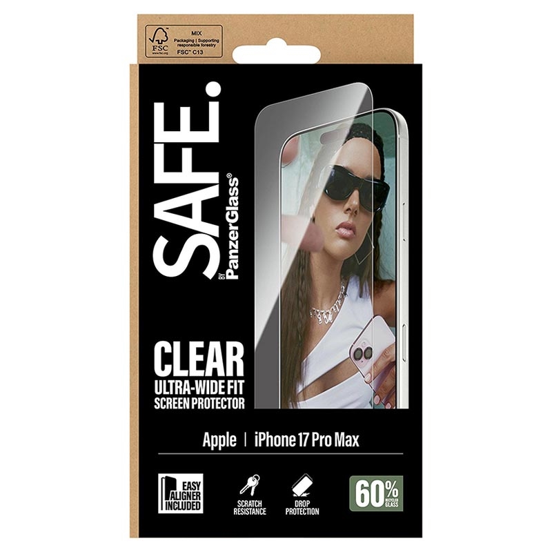 SAFE. by PanzerGlass skjermbeskytter for iPhone 17 Pro Max gir overlegen beskyttelse med 60 % resirkulert glass, som beskytter enheten mot fall, riper og støt. Den ultrabredde passformen sikrer full dekning og klar sikt på skjermen, samtidig som det fingeravtrykksbestandige belegget holder skjermen ren. Med 100 % berøringsfølsomhet og enkel montering ved hjelp av den medfølgende EasyAligner, kombinerer denne skjermbeskytteren bærekraft og funksjonalitet på en sømløs måte.