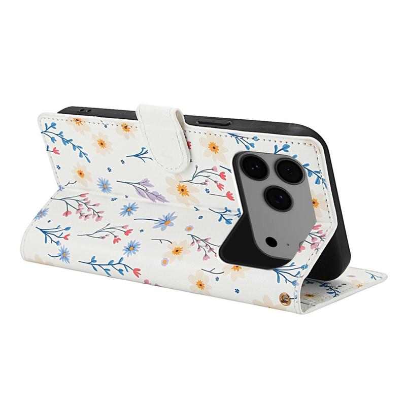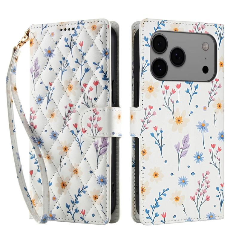 Rombisk blomsterlommebok-etui for iPhone 17 Pro - med stropp og kortspor