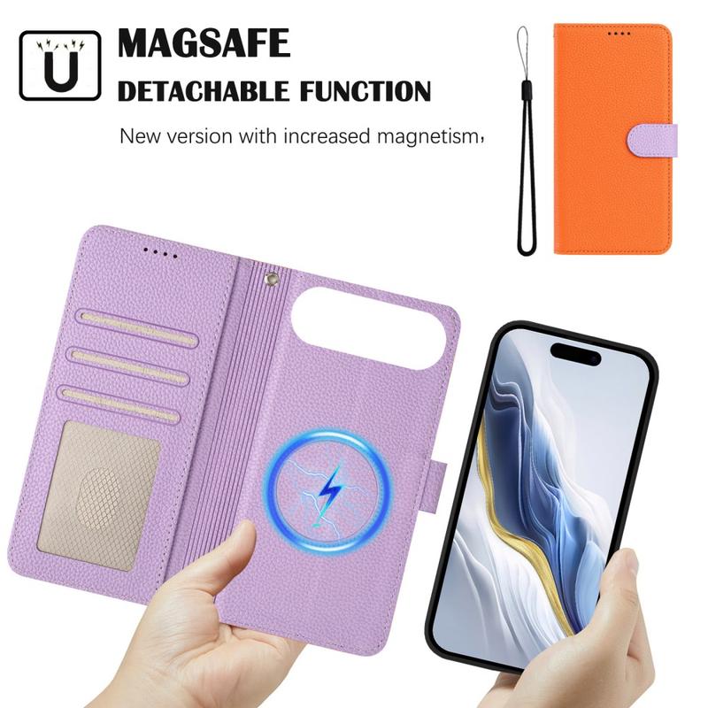 Den magnetiske designen gjør at du kan ta av lommeboken når du vil ha en slankere profil - eller sette den på igjen når du trenger det viktigste. Den fungerer også som støtteben for komfortabel håndfri bruk.
