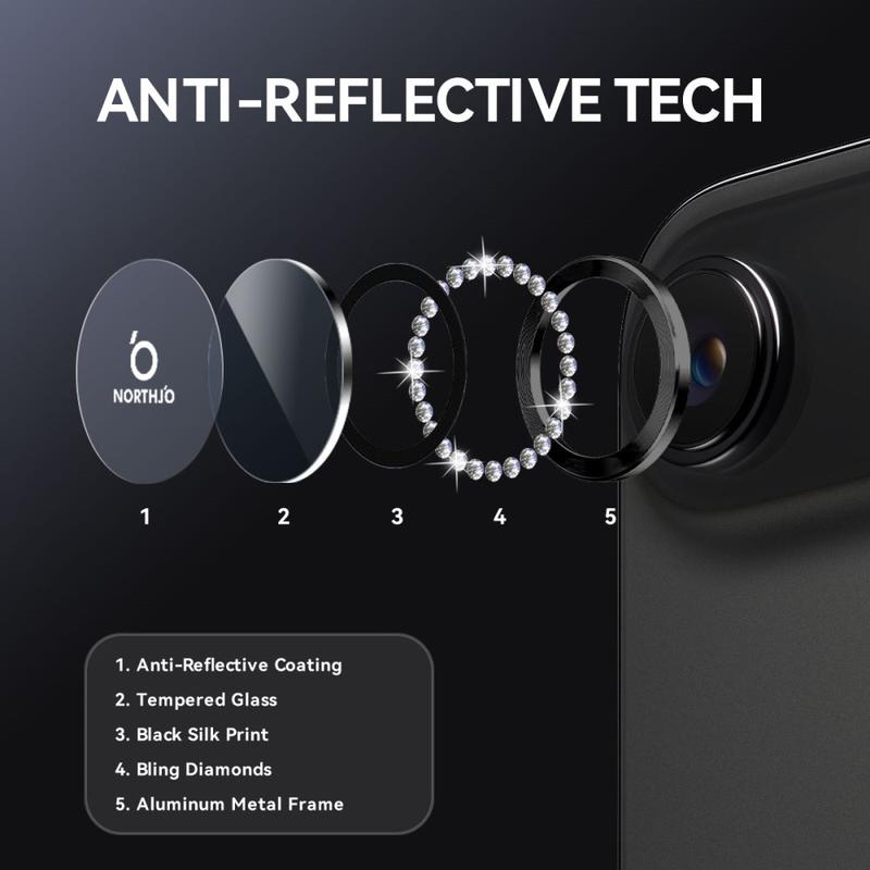 NORTHJO Rhinestone Lens Protector tilbyr det beste fra begge verdener - førsteklasses glitter og høy styrke og holdbarhet. Det forbedrer telefonens utseende samtidig som det gir profesjonell fotoklarhet og hverdagsbeskyttelse.