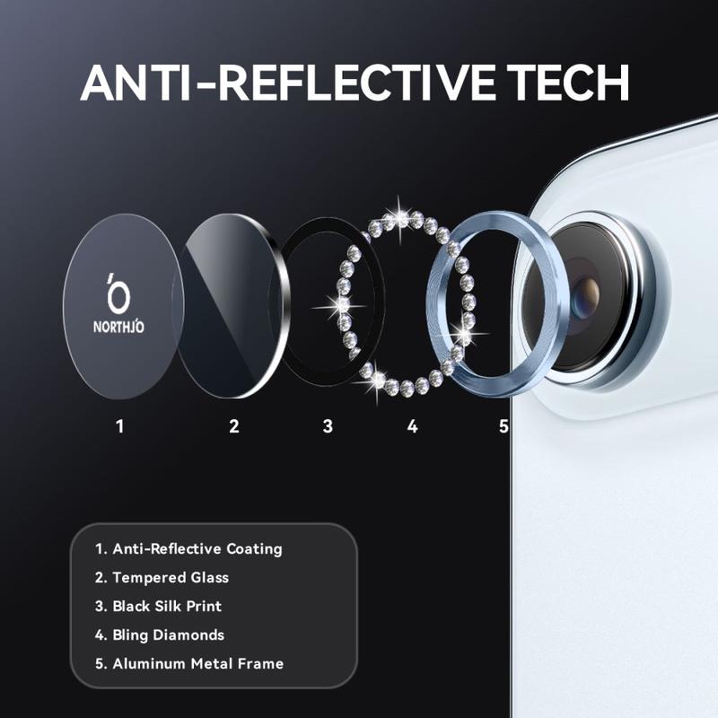 NORTHJO Rhinestone Lens Protector tilbyr det beste fra begge verdener - førsteklasses glitter og høy styrke. Det forbedrer telefonens utseende samtidig som det gir profesjonell fotoklarhet og hverdagsbeskyttelse.
