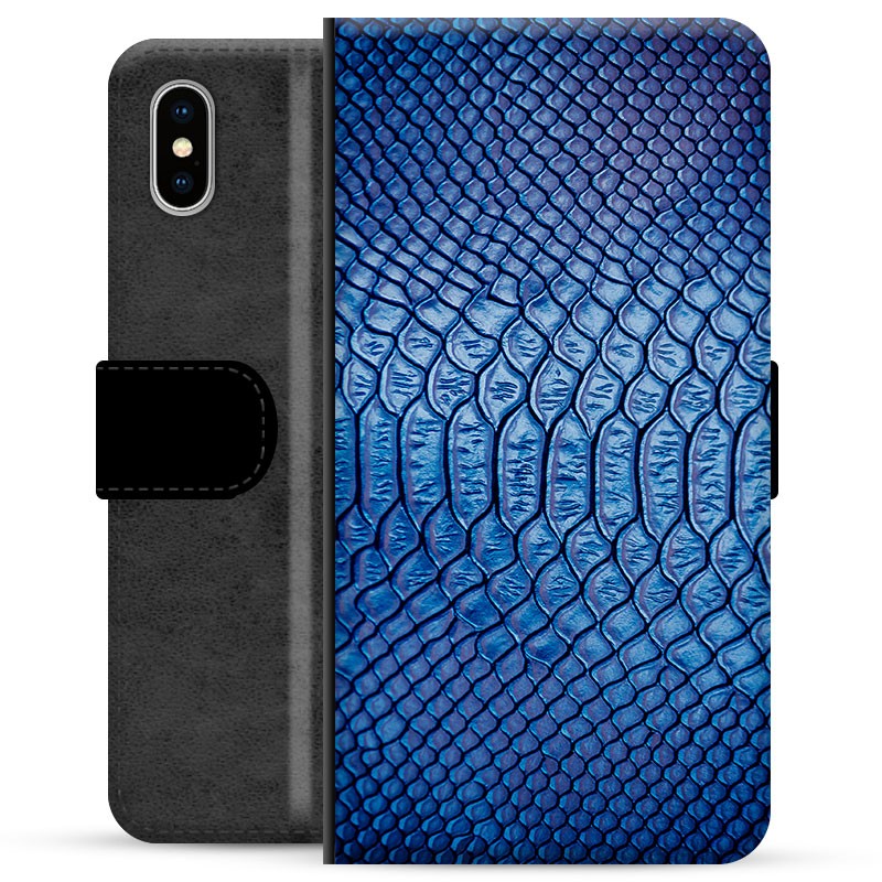 Dette elegante lommebok-dekselet for iPhone X / iPhone XS er laget av høykvalitets lær for å gi din telefon en luksuriøs følelse samtidig som den beskytter den mot hverdagslig slitasje. Med en iøynefallende blå slangeskinn tekstur gir dette dekselet ikke bare en unik stil, men det tilfører også en taktile opplevelse til din enhet.