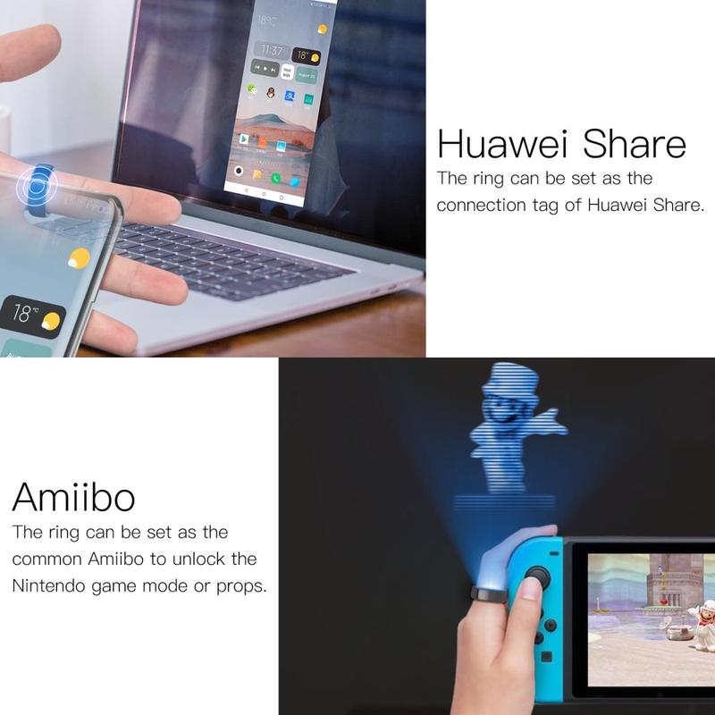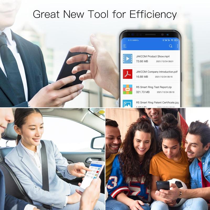 JAKCOM R5 er en multifunksjonell smartring som kan erstatte 6 nærhetskort samtidig, sosial deling, støtte Apple-snarveier, trådløs flashdisk, virtuell samtale og SOS, samhandle med mobiltelefoner for å realisere spesialfunksjoner som "sosial deling", "trådløs USB-flashdisk", "Smart Home Trigger" osv.