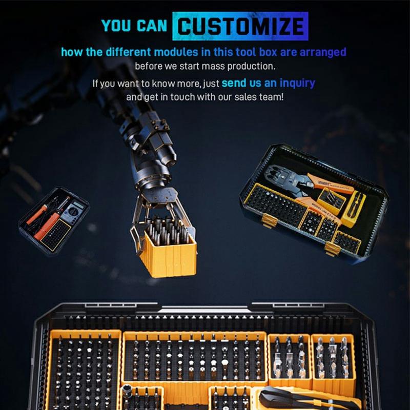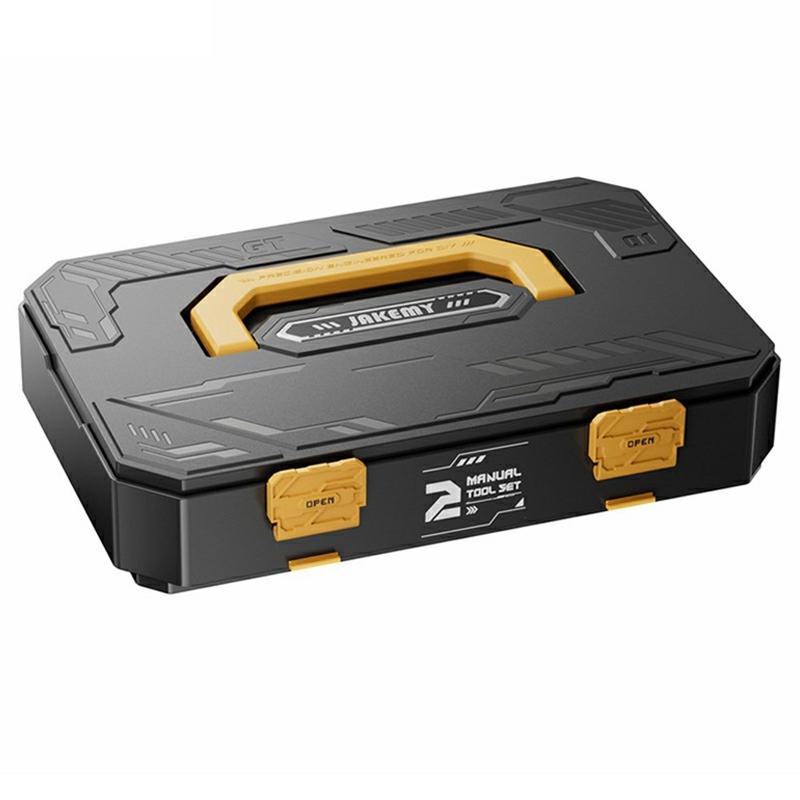 JAKEMY JM-8199 257-i-1 Home Repair Tool Kit er en komplett løsning for vedlikehold i hjemmet, gjør-det-selv-prosjekter og profesjonelle reparasjoner. Settet er modulært oppbygd, slik at du kan tilpasse kombinasjoner for ulike reparasjonsscenarier, noe som gjør det svært allsidig. Den medfølgende 2-i-1 manuelle skrutrekkeren støtter H4.0- og H6.3-bits uten adaptere, og er utstyrt med en tosidig kontakt for rask blindinnføring. Det ergonomiske håndtaket øker dreiemomentet med 20 %, noe som gir opptil 5NM for effektiv ytelse. Med praktisk, innebygd bitsoppbevaring og et bærbart design sørger dette verktøysettet for at du er klar for alle reparasjonsoppgaver hjemme eller på farten.