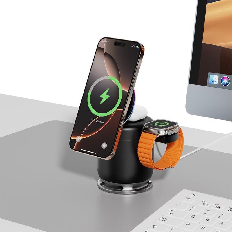 JJT-C52 Qi2 magnetisk trådløs lader er en allsidig 3-i-1-ladeløsning som kombinerer rask trådløs strøm, Bluetooth-lyd og stemningsfull RGB-belysning i én kompakt enhet. Med støtte for Qi2 magnetisk 15W hurtiglading, kan den justeres sikkert med kompatible smarttelefoner - selv gjennom etuier - for effektiv og stabil strømlevering. Den innebygde Bluetooth 5.3-høyttaleren gir oppslukende lyd av høy kvalitet, mens justerbar RGB-belysning forvandler skrivebordet eller nattbordet til et koselig, moderne oppsett. Med dedikerte ladesoner for telefonen (15W), smartklokken (2,5 W) og øreproppene (5 W), samt et sammenleggbart stativ som støtter flere visningsvinkler, er JJT-C52 det perfekte alt-i-ett-tilbehøret for arbeid, underholdning og hverdagskomfort.