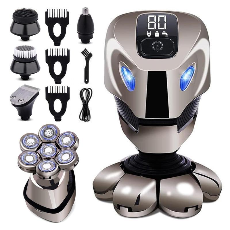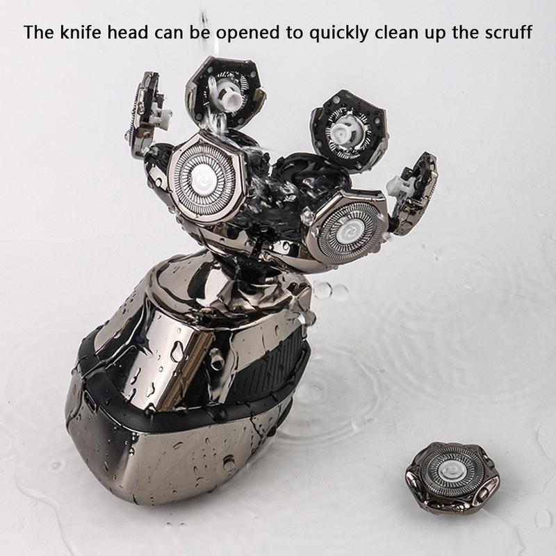 - 5-i-1 pleiesystem: Inkluderer 7D flytende barberhode, hårtrimmer, nesehårtrimmer, ansiktsrengjøringsbørste og ansiktsmassasjesvamp for allsidig pleie.