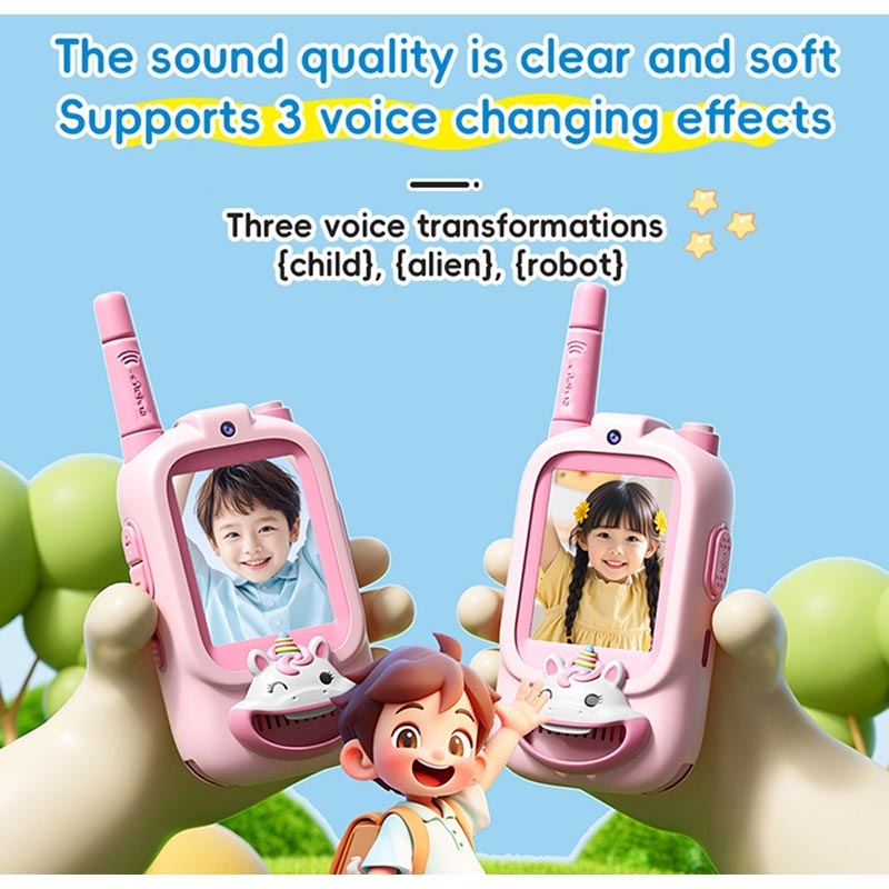 Hold kontakten med barnet ditt som aldri før ved hjelp av JK200 video-walkie-talkiesettet, som er designet for trygg videokommunikasjon i sanntid uten WiFi eller komplisert oppsett. Med innebygde oppladbare batterier, morsomme stemmeeffekter og en slitesterk konstruksjon er dette den perfekte dingsen for utendørsopplevelser, familieturer eller hverdagslek.