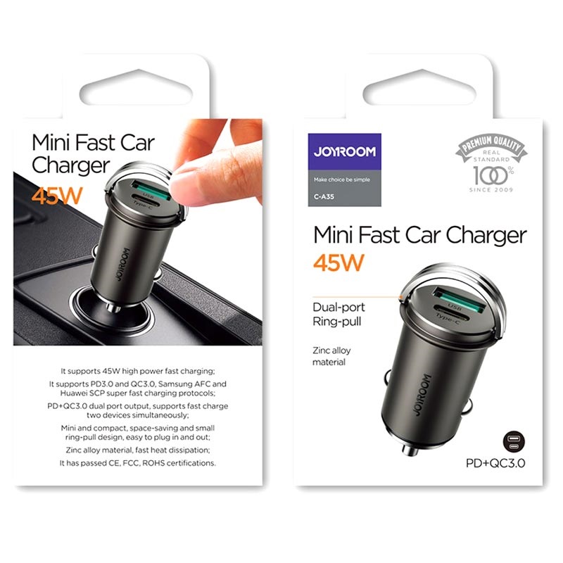 Denne modellen legger til en Type-A og en Type-C ladeport til bilens interiør. Begge portene støtter hurtigladningsprotokoller, og Joyroom C-A35 kan levere en total effekt på 45W, noe som sikrer effektiv ytelse.