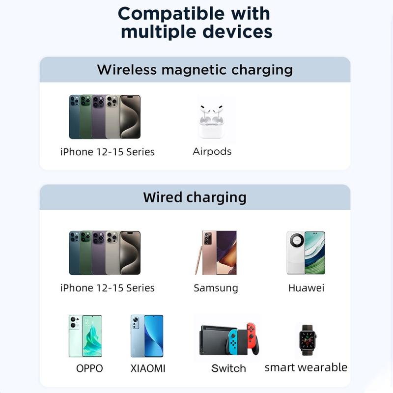 Leveres med en avtakbar kabel, kan lade tre enheter med én kabel, inkludert for Apple/Android-enheter/selvlading