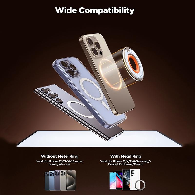- Inkluderer magnetisk ring for å muliggjøre bruk med ikke-magnetiske telefoner