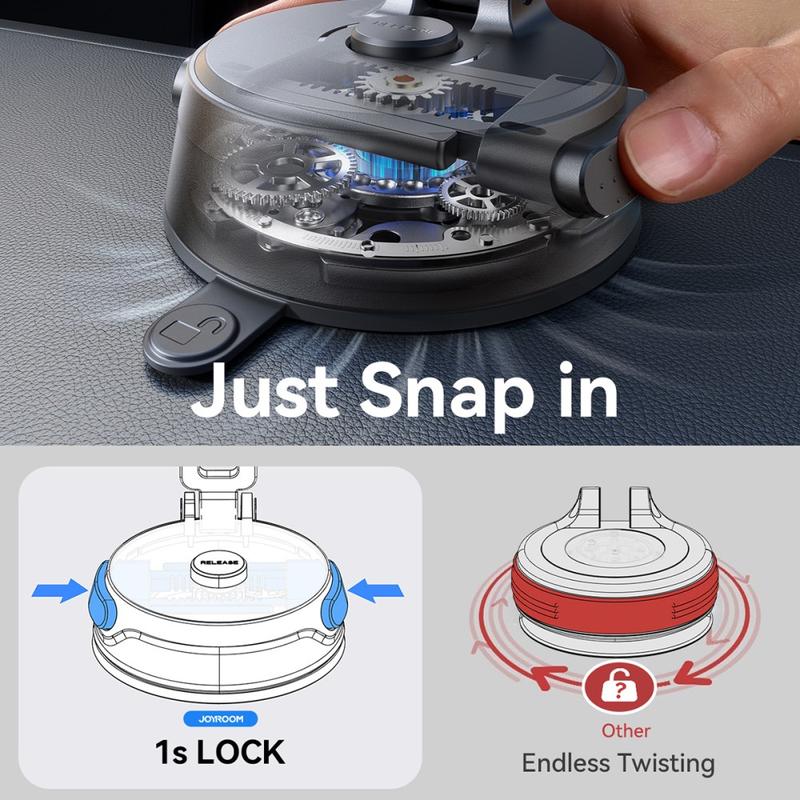 JOYROOM JR-ZS510 sammenleggbar magnetisk bilholder er laget for sjåfører som ønsker en rask, stabil og sikker montering uten konstant justering. Den bruker 22 N55 høytytende magneter for et sterkt magnetisk grep som holder seg stabilt på humpete veier, mens den gjenbrukbare gel-sugekoppen fester seg godt til glatte overflater som dashbord og frontruter. Installasjonen er rask og frustrasjonsfri takket være 1-sekunders snap-in-låsemekanismen, som fester sugekoppen øyeblikkelig uten endeløs vridning. Doble metallstøttearmer forbedrer stabiliteten, og et slitesterkt metallpivotledd er designet for å opprettholde jevn dempingsytelse selv etter gjentatte rotasjoner.