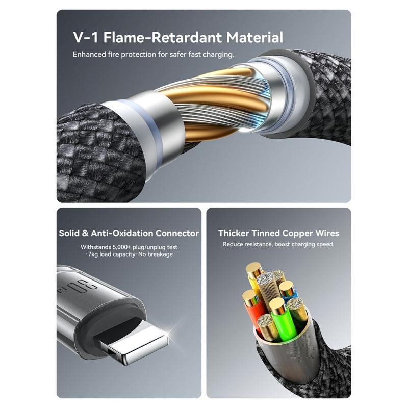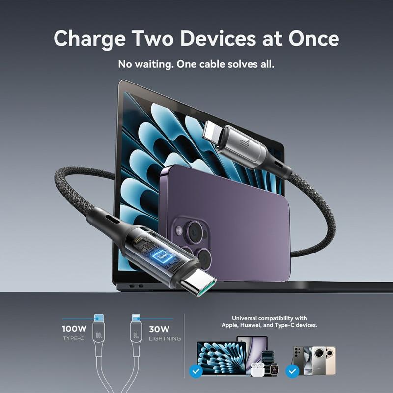 Lad og synkroniser flere enheter med én smart kabel. JOYROOM S-A57-ladekabelen med to kontakter kombinerer USB-C til USB-C med en ekstra Lightning-kontakt, slik at du får fleksibel kompatibilitet for ulike enheter uten å måtte bære med deg flere kabler. Den støtter opptil 100 W hurtiglading på kompatible USB-C-enheter og tilbyr opptil 480 Mbps dataoverføring for daglig synkronisering. Den 1.5m lange kabelen har en slitesterk flettet nylonkappe og ABS-kontakthus, og er ideell for skrivebord, sofaer og på reiser - slik at du får en komfortabel rekkevidde uten floker.