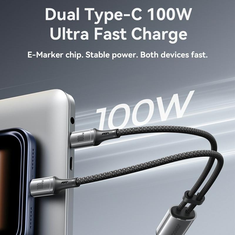 Joyroom S-A57 USB-C til dobbel USB-C-kabel - 100 W hurtiglading med E-Marker, 480 Mbps datasynkronisering, nylonflettet, kabelbinder inkludert