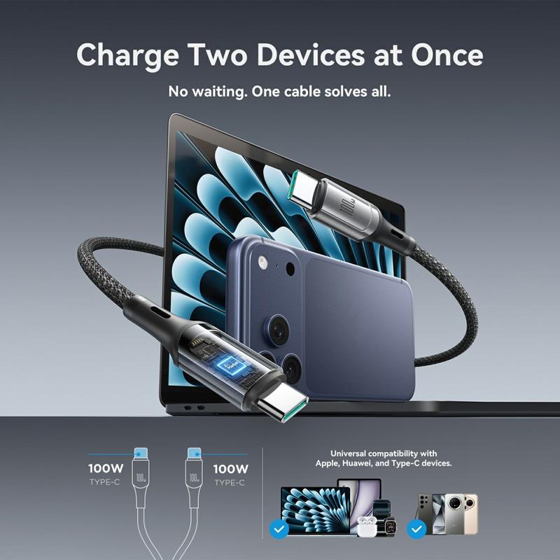 Hvis du bruker flere USB-C-enheter, vil denne kabelen redusere rotet og gjøre ladingen enklere. Du får høyeffekts 100 W-støtte, smart strømstyring og en robust, flettet konstruksjon designet for daglig bruk - i tillegg til det praktiske organiseringsbåndet for enkel oppbevaring.
