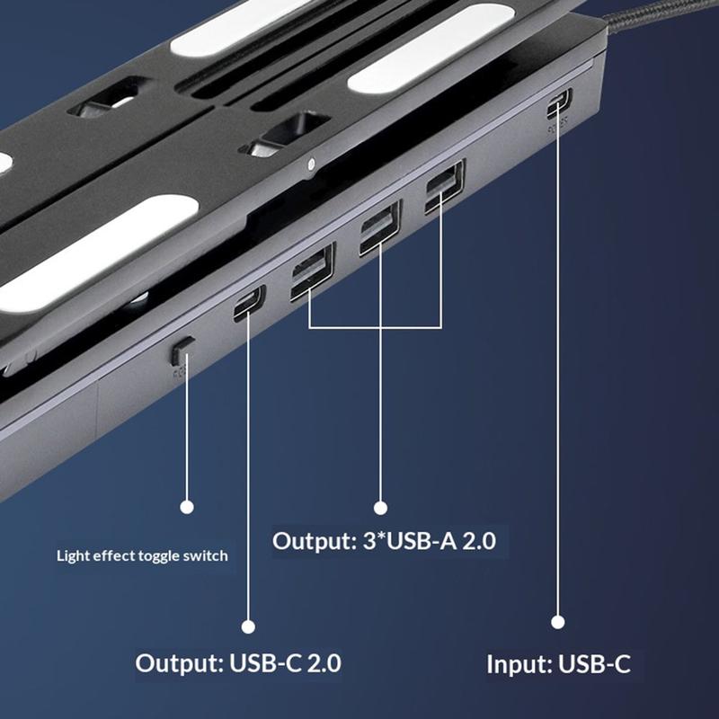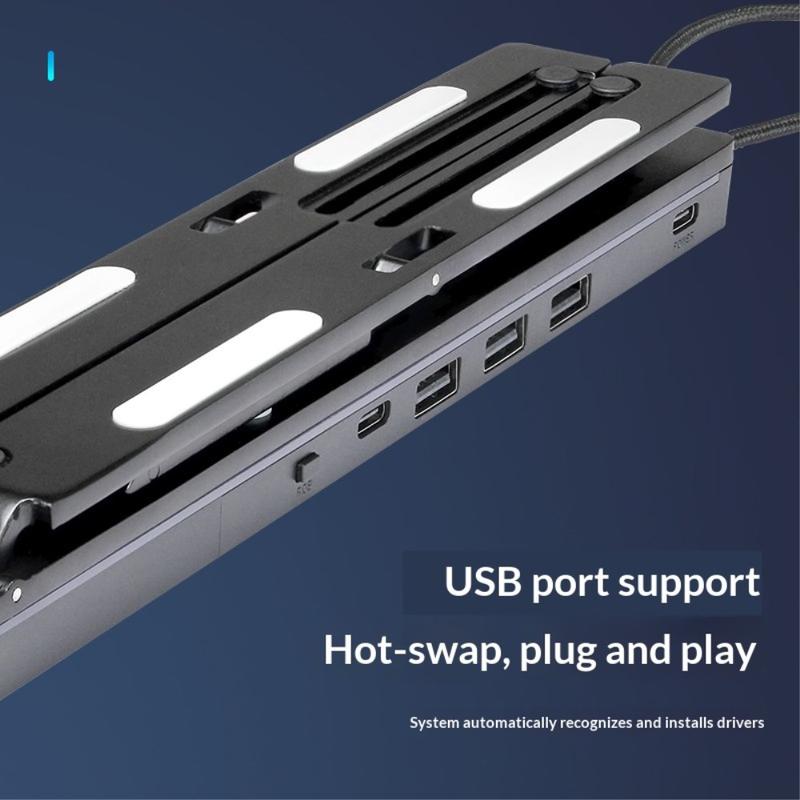 Den innebygde USB-huben har 4 porter: 3 × USB-A 2.0 og 1 × USB-C 2.0. Den støtter hot-swapping og plug-and-play-bruk, slik at du kan koble til eksterne enheter som mus, tastatur, USB-stasjon eller ladekabel direkte gjennom stativet.