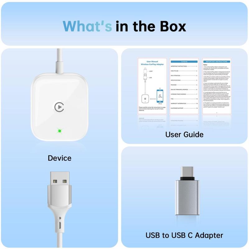 Oppgrader kjøreopplevelsen med Wireless CarPlay Adapter, som er utviklet for å forvandle ditt kablede CarPlay-system til en trådløs tilkobling. Få full funksjonalitet med Apple CarPlay uten å måtte bruke kabler. Plug & Play-installasjonen gjør det enkelt å sette den opp, slik at du kan bruke iPhone-funksjonene sømløst via bilens display, berøringsskjerm og rattkontroller.