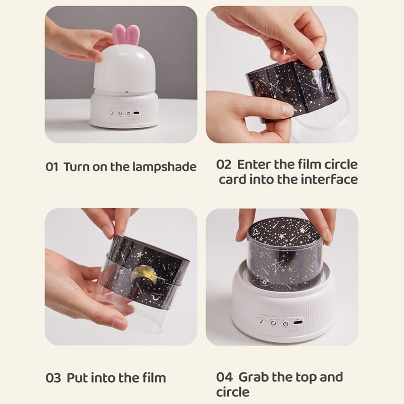 Forvandle ethvert rom til en beroligende oase med den fjernstyrte kaninprojeksjonslampen. Denne multifunksjonelle nattlampen er designet i en finurlig kaninform og projiserer myke, beroligende lys og spiller rolig musikk for å skape en avslappende atmosfære, perfekt for å slappe av eller hjelpe barn med å sove. Lampen er USB-drevet og har en rekke lys- og lydinnstillinger som styres med en intuitiv fjernkontroll, noe som gjør den ideell for enhver leggerutine.