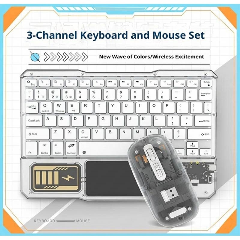 KB333 gjennomsiktig Bluetooth-tastatur- og musesett - trådløst tastatur med 3 kanaler og RGB-bakgrunnsbelysning samt touchpad