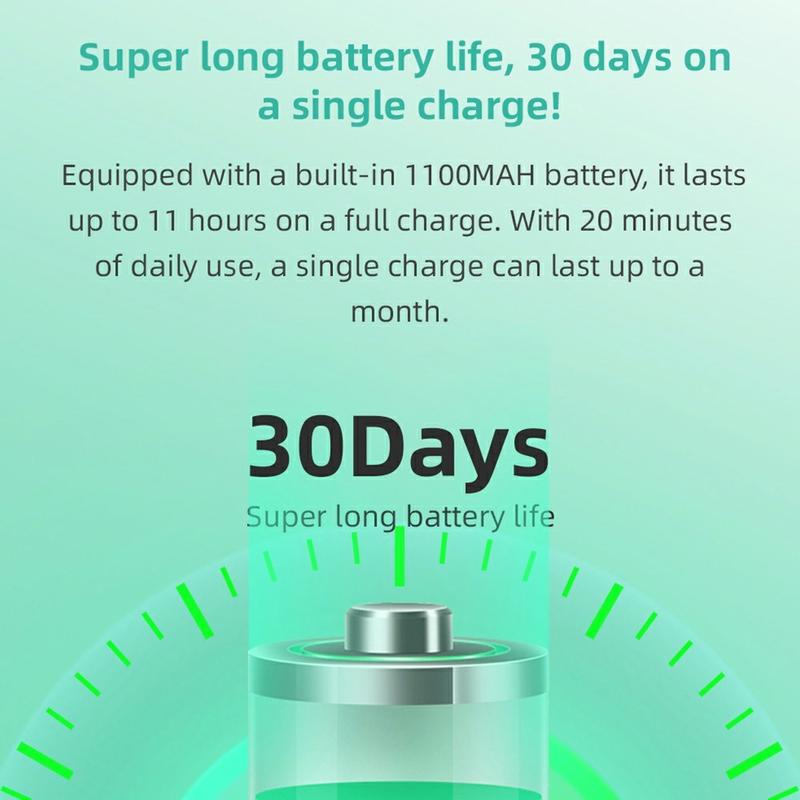 - Lang batterilevetid: Enheten drives av et 1100 mAh-batteri, og gir opptil 11 timers drift på en enkelt 1,5-timers lading, noe som sikrer uavbrutte muskelavslappende økter.