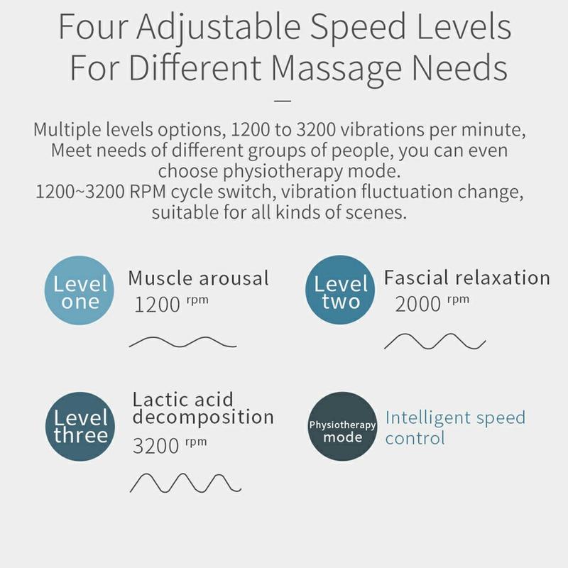 - Fire justerbare hastighetsnivåer: Tilpass massasjeopplevelsen med fire hastighetsinnstillinger, slik at du kan justere intensiteten etter ulike muskelgrupper og personlige preferanser.