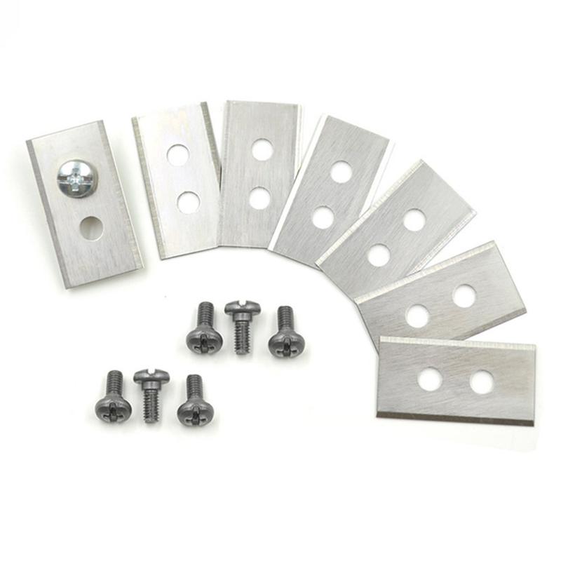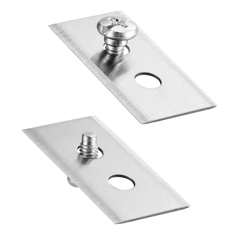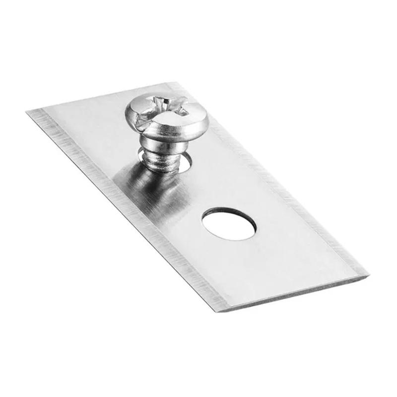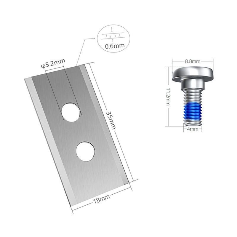 Med presise dimensjoner på 35 x 18 x 0,75 mm og en monteringsdesign med to hull er bladene laget for en sikker passform og stabil drift på kompatible robotklippere. Settet inkluderer også matchende skruer med blå gjengestopp for å forhindre at de løsner under bruk, noe som gjør vedlikeholdet enklere og mer pålitelig.
