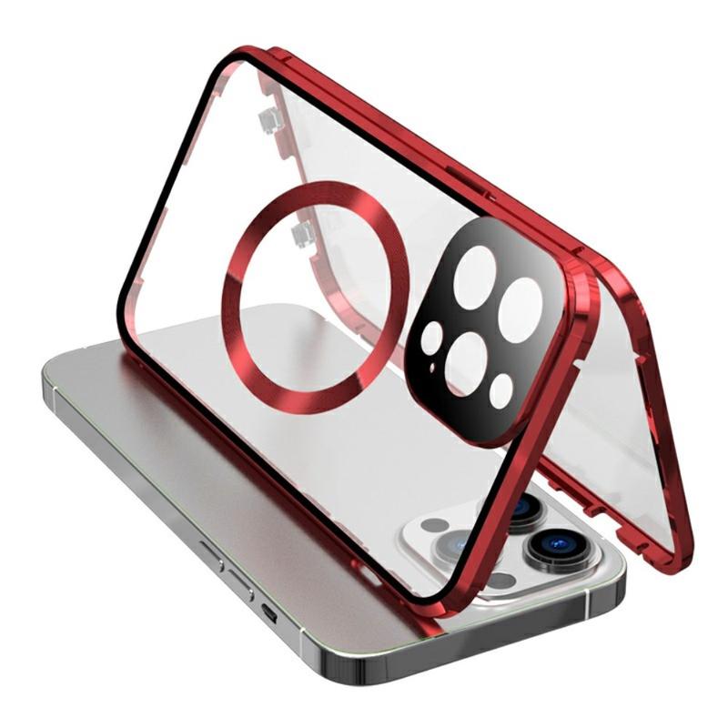 Kompatibel med MagSafe Case for iPhone 15 Pro Magnetisk metallramme + dobbeltsidig telefondeksel i herdet glass med spennelås - rød