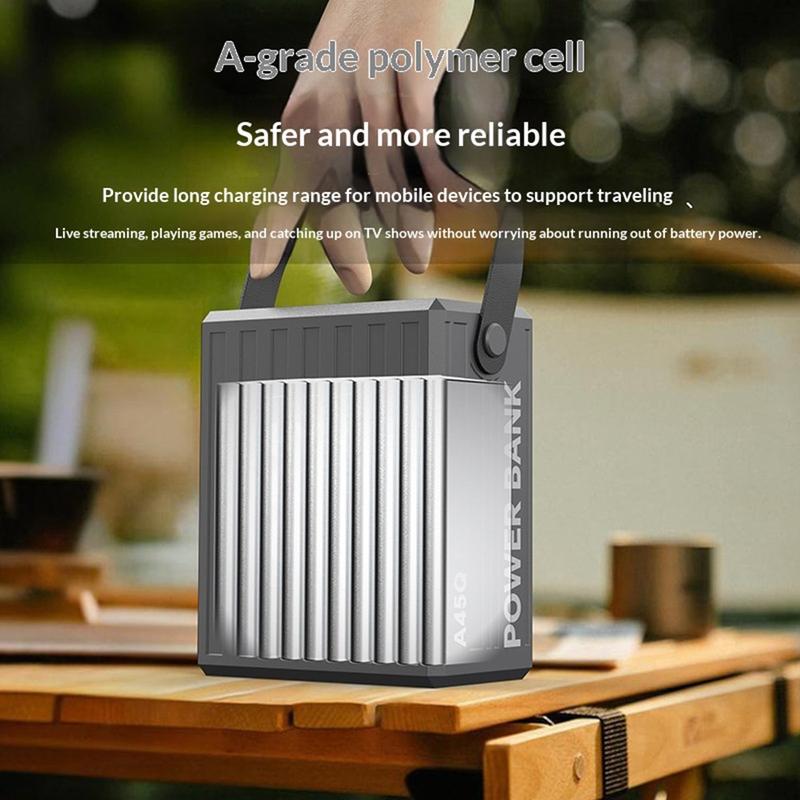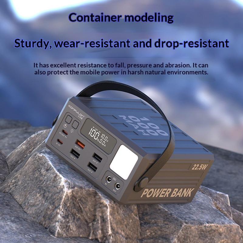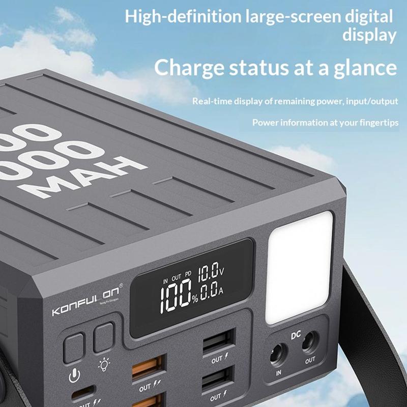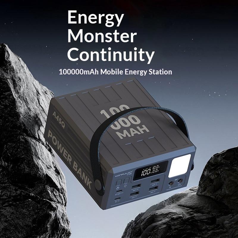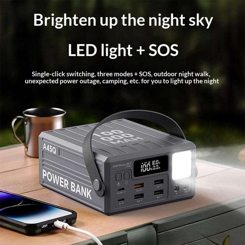 Lad flere enheter lenger med Konfulon A45Q 100000mAh-powerbanken. Denne ladestasjonen med høy kapasitet er utviklet for reiser, friluftsliv, camping og som reservestrøm hjemme, og tilbyr pålitelig energilagring med 7 utgangsporter for praktisk lading av flere enheter samtidig.