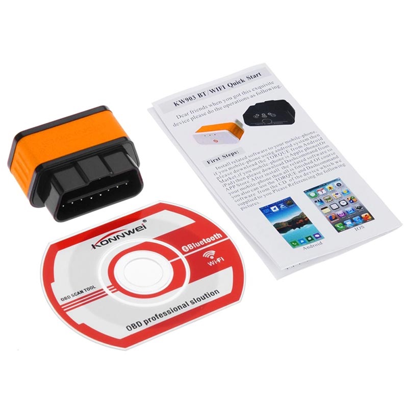 Lett å bruke! Alt du trenger å gjøre er å laste ned den tilhørende App fra App Store/Play Store på enheten din, og koble den sammen med Konnwei KW903 via WiFi. Du kan også bruke den med PCen, takket være den medfølgende CD-programvaren. Konnwei KW903 ELM327 bilmotor feil diagnostisk skanner støtter alle OBD-II protokoller.
