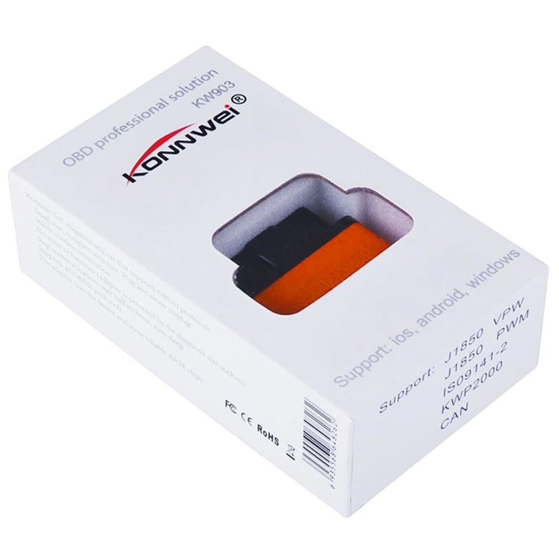 - Konnwei KW903 ELM327 kodeleser støtter J1850 VPW, J1850 PWM, ISO9141-2, KWP2000 og CAN OBD2 protokoller