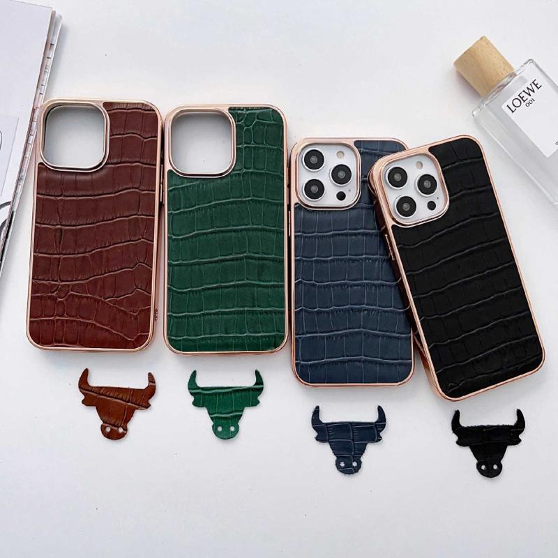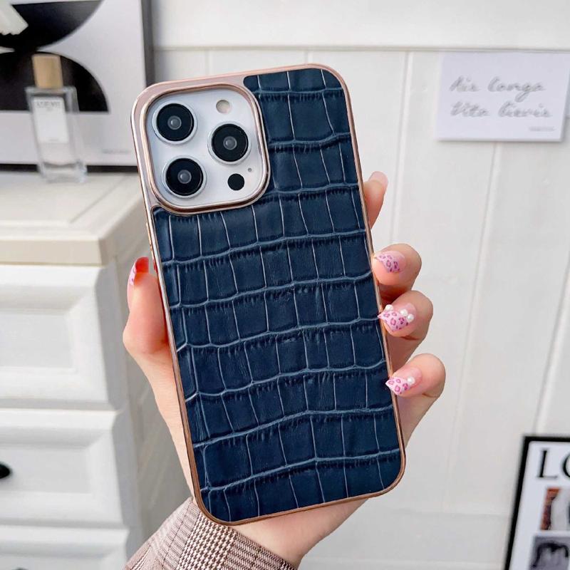 Mobiltelefondeksel til iPhone 14 Pro Max, krokodilletekstur ekte skinn+TPU Nano galvanisering telefonbakdeksel