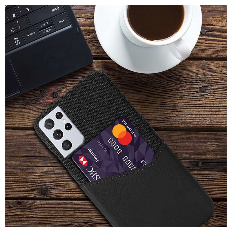 Det solide polykarbonatdekselet er dekket med fasjonabelt stoff som passer godt til det elegante og tynne designet. Det myke laget av polyuretan danner en diskret kortlomme som gjør dekselet enda mer praktisk. Det robuste, støtdempende dekselet er laget for å passe hånd-i-hanske for din Samsung Galaxy S21 Ultra 5G, og funksjonaliteten påvirkes ikke.
