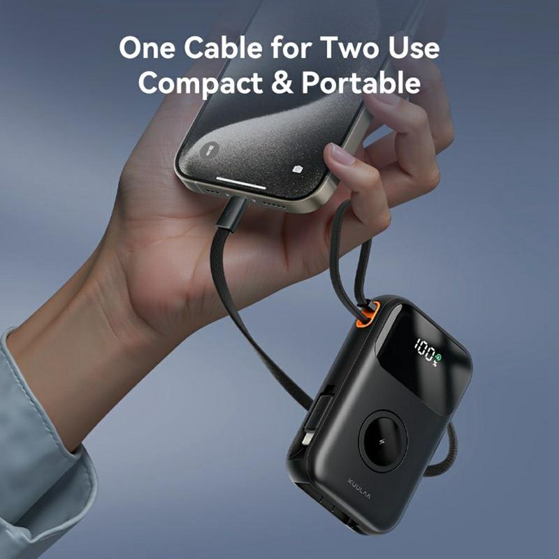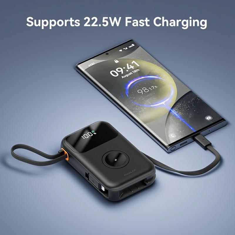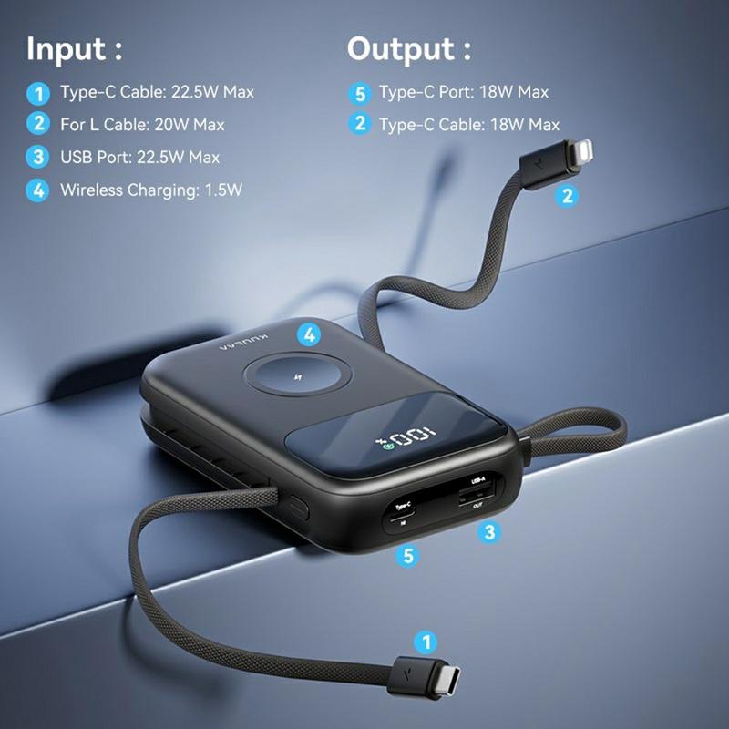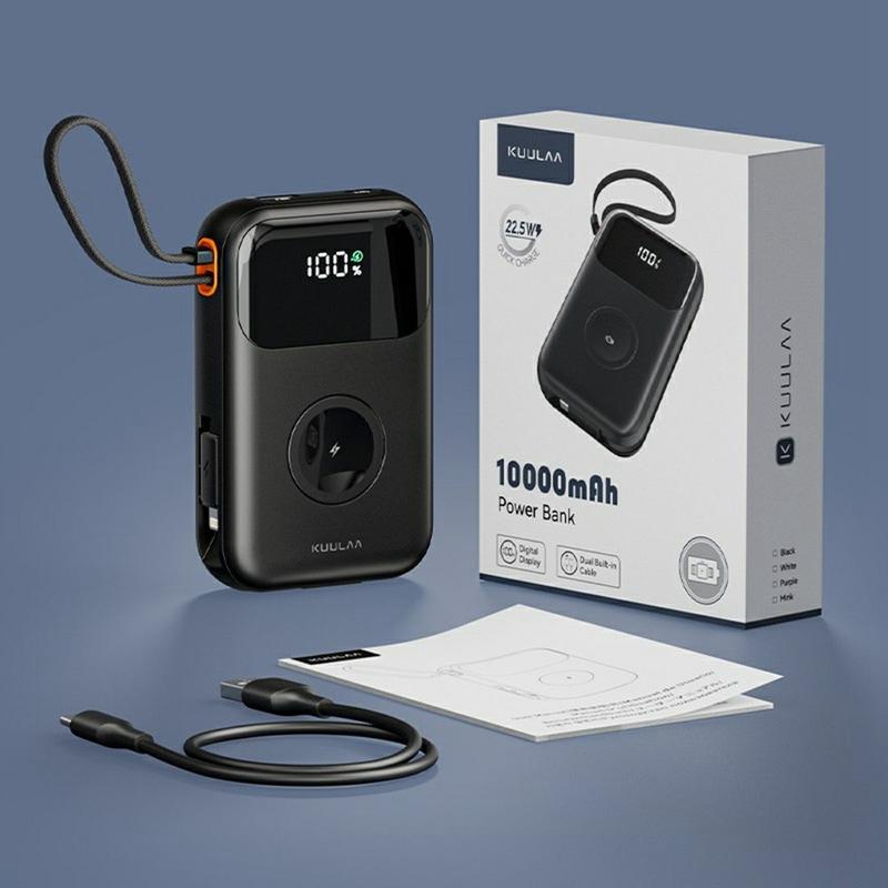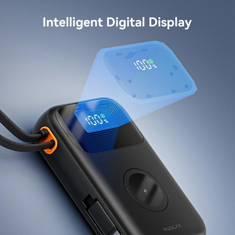 Hold enhetene dine oppladet når du er på farten med Kuulaa KL-YD80 Digital Display Power Bank. Denne bærbare laderen på 10 000 mAh har to innebygde kabler, støtte for 22,5 W hurtiglading og et smart digitalt display som sørger for at enhetene dine lades effektivt og enkelt.