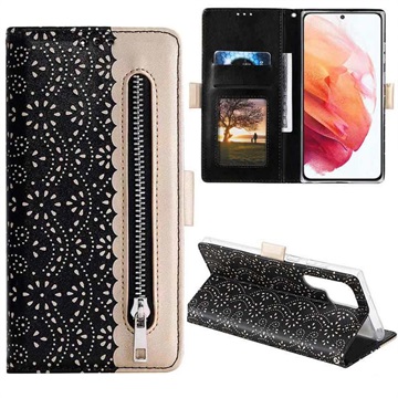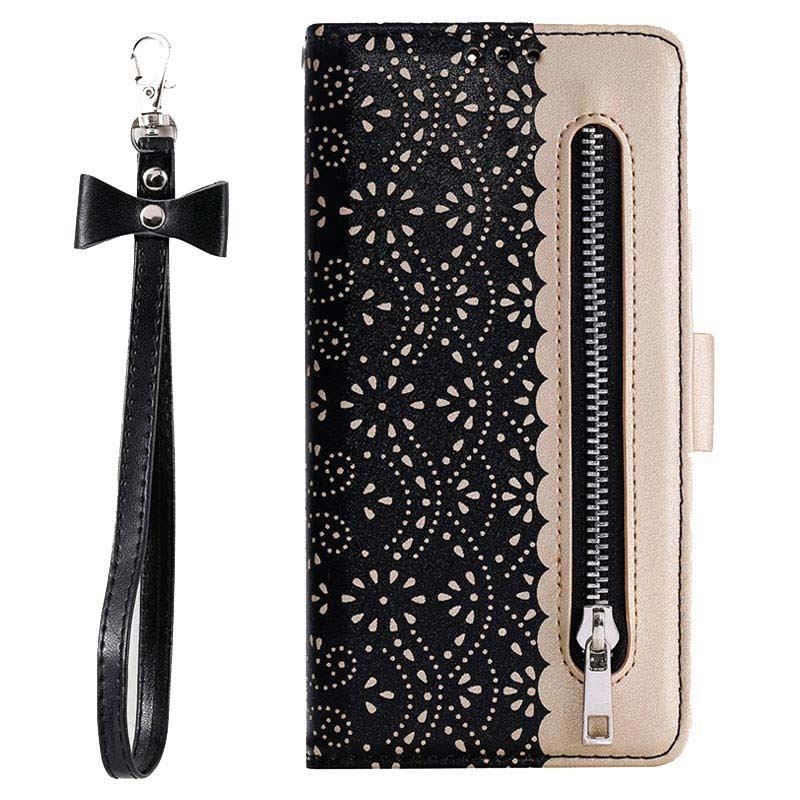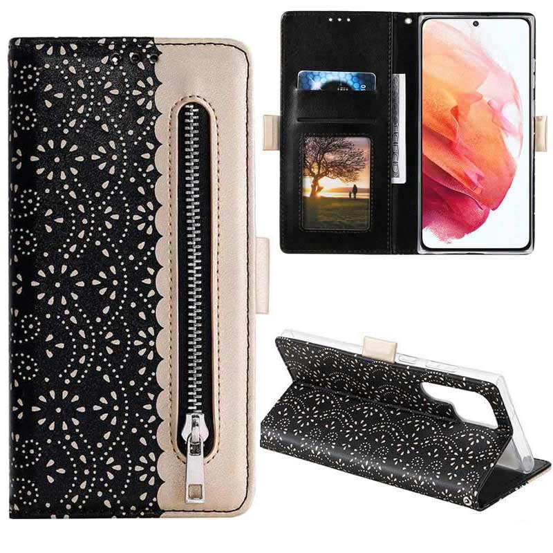 Hold din Samsung Galaxy S22 Ultra 5G i perfekt stand med dette fasjonable design dekselet som har et flott mønster av blonder. I tillegg til telefonen din, kan du lagre alle viktige kort og pengene dine i en egen praktisk pengelomme.
