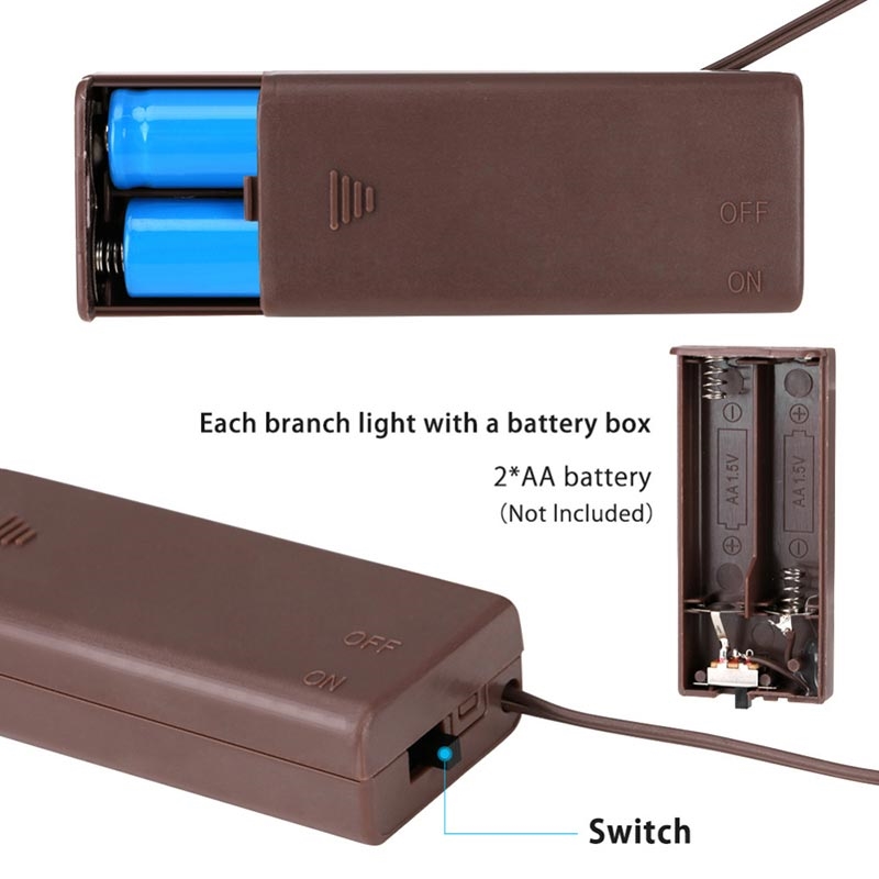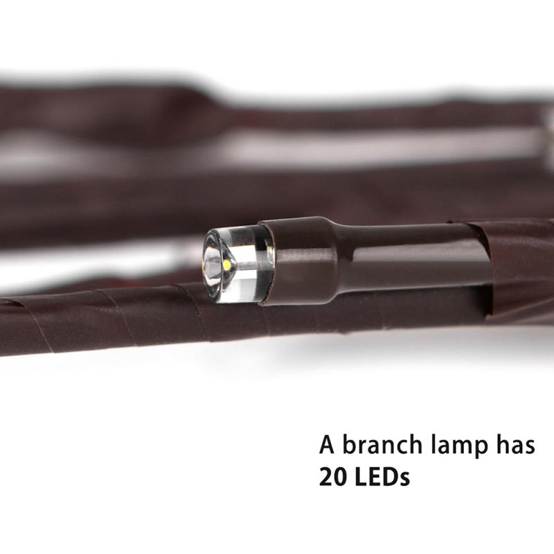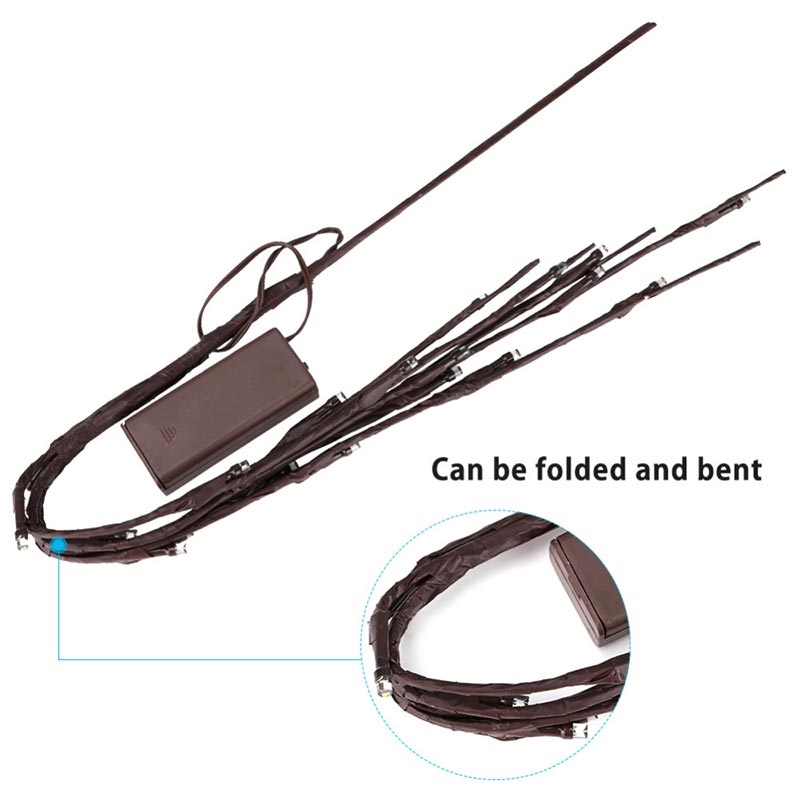 Disse 20-LED-simulerte tregrenene gir en varm og fortryllende glød til ethvert rom. De har bøyelige grener og drives trygt av to AA-batterier, slik at de kan formes fritt for å skape ditt eget look. Den myke belysningen gjør blomsteroppsatser, juledekorasjoner, vindusdekorasjoner og interiørstyling enda mer sjarmerende. Plastkonstruksjonen er lett, men likevel slitesterk, noe som gjør dem egnet for innendørs dekorasjoner og utendørs bruk i overbygde områder.