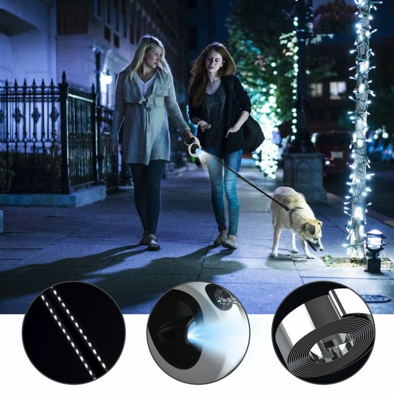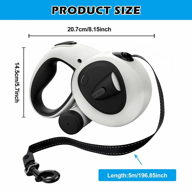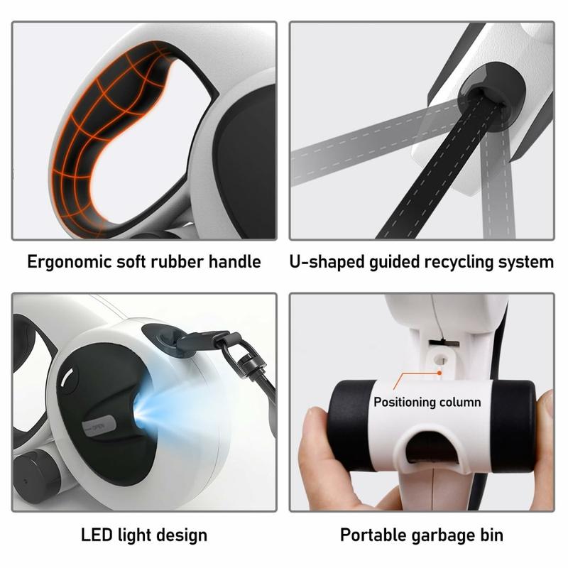 Gi hver tur mer frihet, sikkerhet og stil. Dette 5meter lange uttrekkbare båndet har en lyssterk USB-oppladbar LED-lommelykt, reflekterende bånd med høy synlighet og et silkemykt bremsesystem med én knapp som kontrollerer selv de største rasene (opptil 50kg). Et ergonomisk, sklisikkert håndtak gjør det behagelig å gå lange turer, og den integrerte avfallsposedispenseren gjør at du alltid er forberedt.
