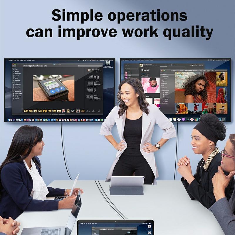 Adapteren er kompatibel med enheter med USB-A- eller USB-C-porter, og fungerer sømløst med bærbare datamaskiner, stasjonære datamaskiner og kompatible nettbrett. Den kobles enkelt til skjermer, TV-er og projektorer, noe som gjør den egnet for kontorer, klasserom og hjemmeoppsett.