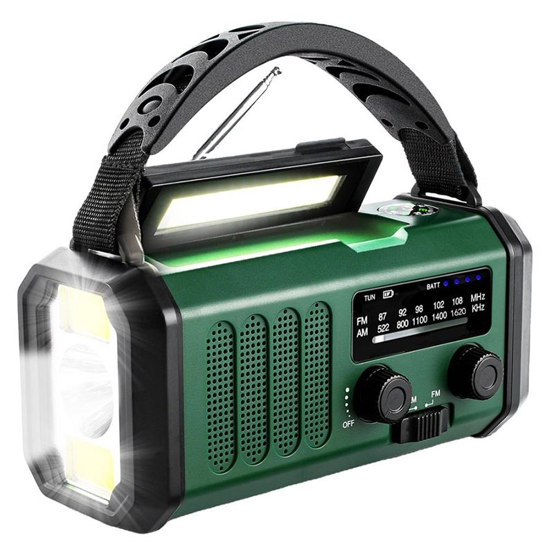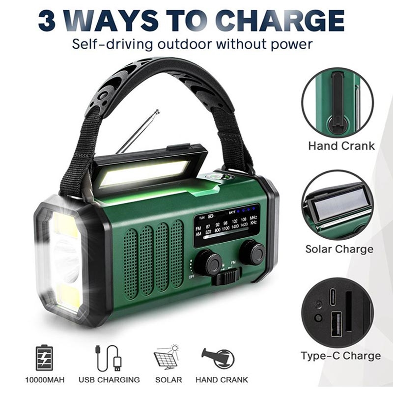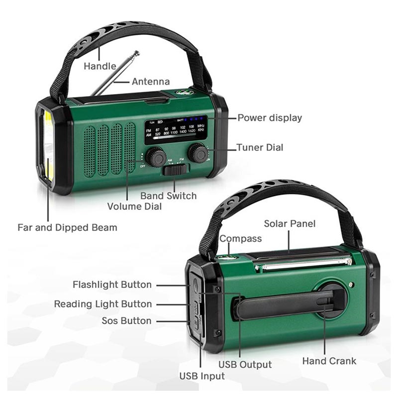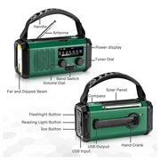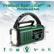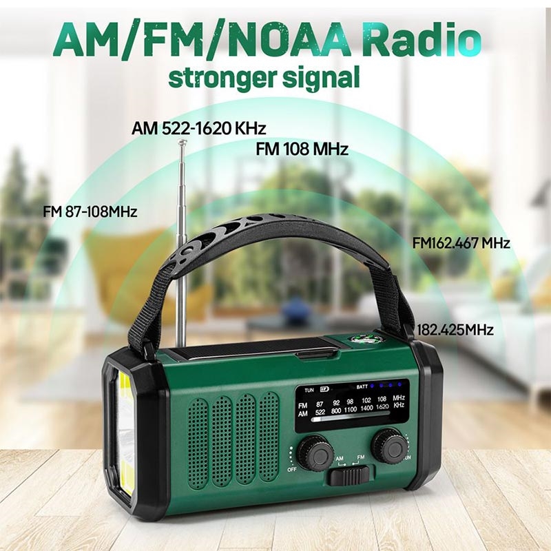- Multifunksjonell nødradio: Dekker AM- (520-1710 kHz), FM- (87-108 MHz) og NOAA- (162,400-162,550 MHz) frekvenser, noe som sikrer tilgang til viktige oppdateringer og informasjon.
