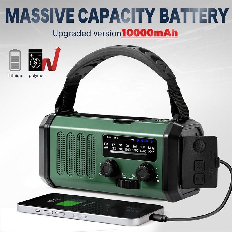- Kraftig kraftbank: Med en kapasitet på 10 000 mAh kan enheten lade opp mobile enheter som smarttelefoner og nettbrett, noe som er avgjørende i nødsituasjoner.