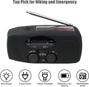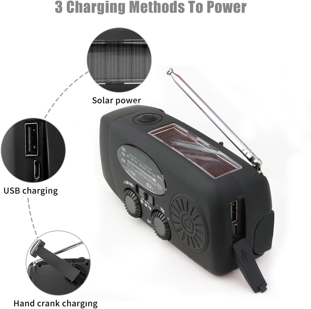 - Flere strømkilder: Bruker håndsveiv, solcellepanel og USB-lading for å sikre kontinuerlig drift under strømbrudd eller utendørsopplevelser.