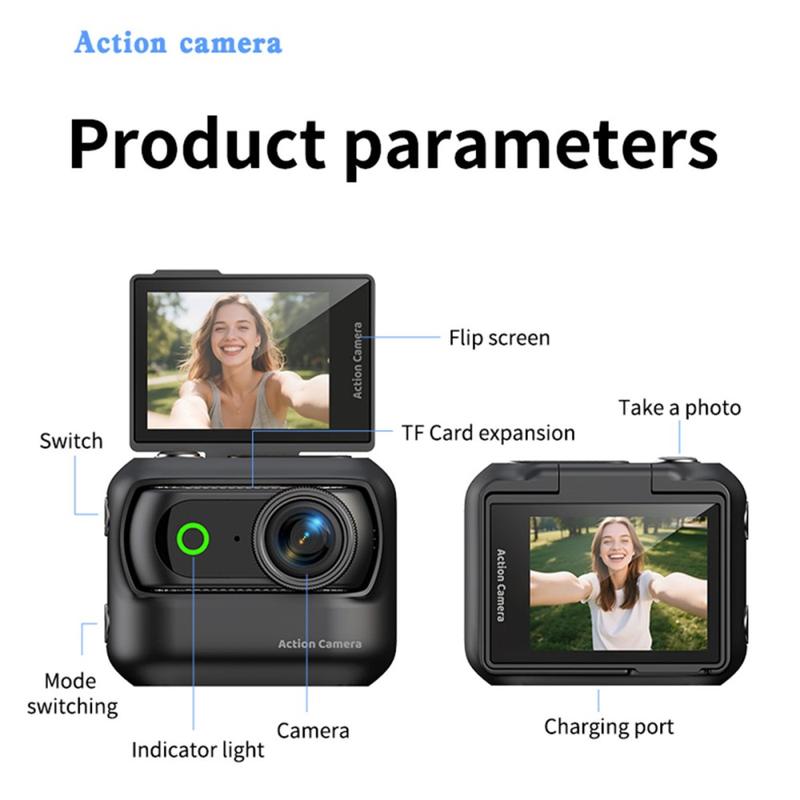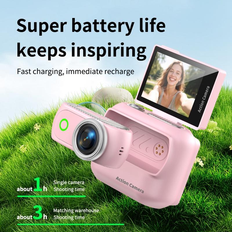 Dette mini-sportskameraet er bygget for fleksibilitet og støtter flere opptaksmoduser, inkludert video, foto, slow motion, time-lapse og ND-speileffekter, noe som gjør det egnet for både uformell opptak og mer kreativt innhold. Den bærbare designen lar deg feste det på et nakkebånd, en lue, en hjelm, et sykkelstyre eller andre kompatible overflater, mens den utvidede batteristøtten hjelper deg med å filme lenger når du er på farten.