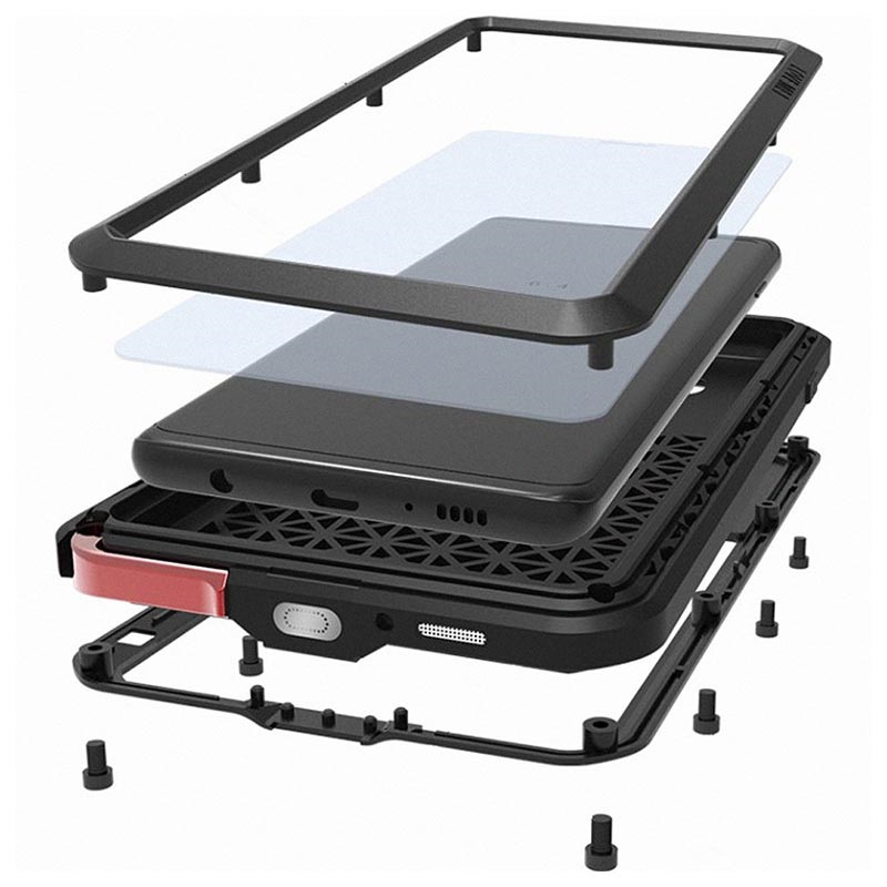 Kraftig deksel har en smart design som holder smarttelefonen beskyttet mot smuss og støv, samt støt. Metallrammen er designet for å passe Samsung Galaxy S10+ perfekt og øker enhetens stabilitet og støtmotstand, mens et herdet glasslag beskytter skjermen mot riper uten å påvirke berøringsfølsomheten.