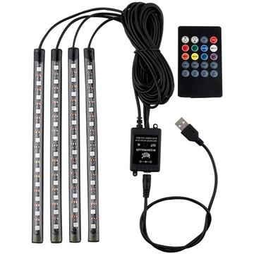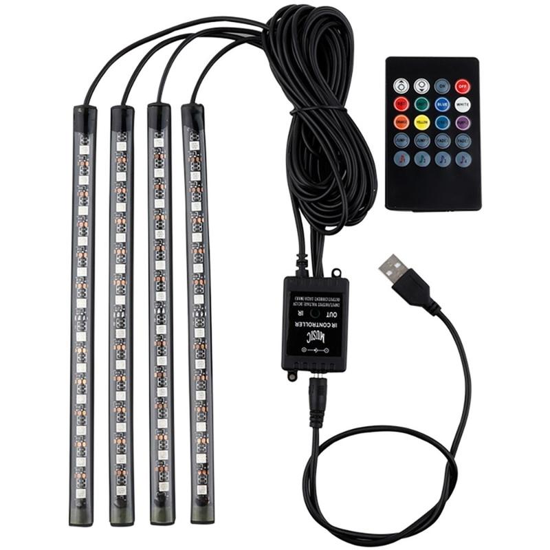 Lydaktiverte innvendige neon LED-lysstriper for bil med trådløs fjernkontroll og USB-port - 4 stk. 36 lysdioder