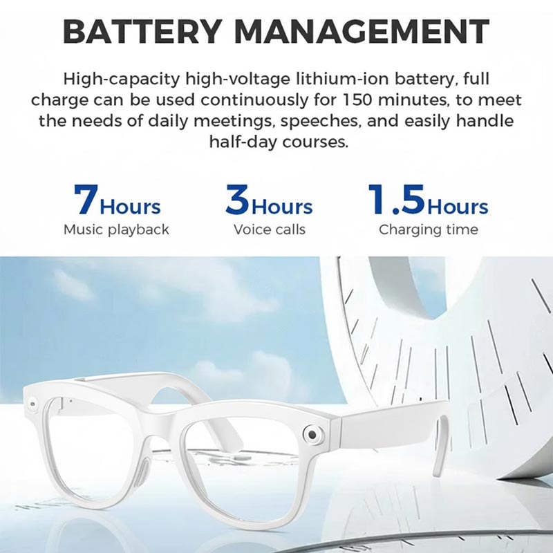 M01S AI-smartbrillene kombinerer intelligent oversettelse, HD-opptak, oppslukende lyd og stemmeinteraksjon i én elegant, bærbar enhet. Brillene er utstyrt med et Sony IMX219 500W-kamera som tar bilder av høy kvalitet og jevn 1080p 30fps-video. Enten du dokumenterer dagen din eller tar opp håndfritt innhold, leverer M01S klarhet og stabilitet med innebygd videooptimalisering.