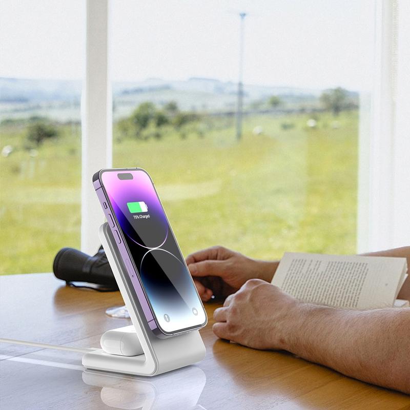 Gjør laderutinen enklere med M2A 2-i-1 magnetisk trådløs lader, et elegant og kraftig skrivebordstilbehør som er designet for å holde iPhone og AirPods oppladet samtidig. Med sin presise magnetiske innretting, vertikale design og sertifiserte sikkerhetsstandarder er den den ideelle følgesvennen i hverdagen, både hjemme, på kontoret og ved sengen.