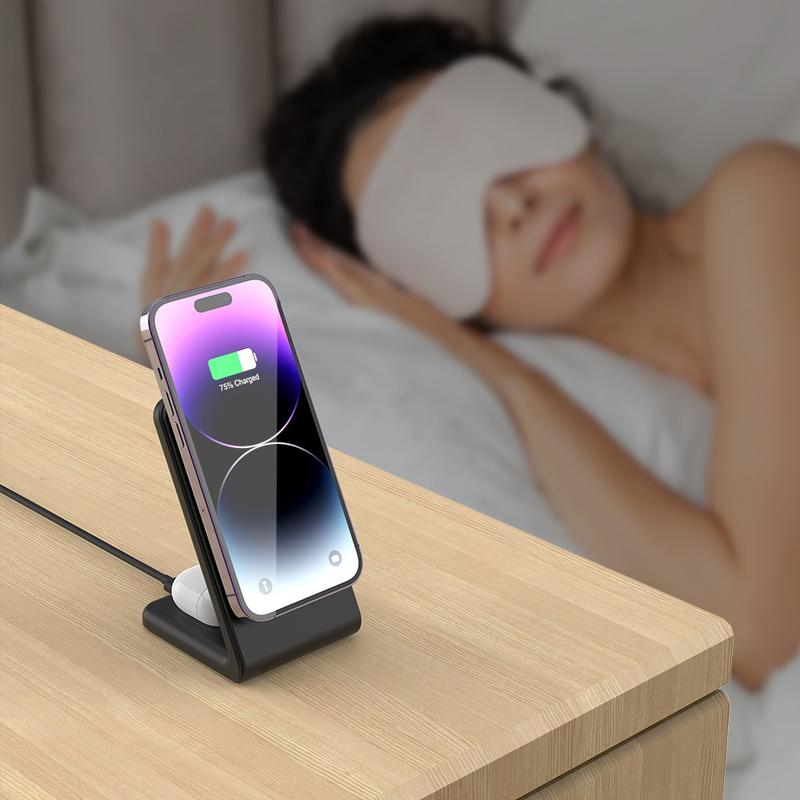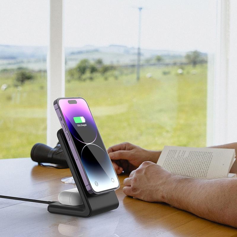 Gjør laderutinen enklere med M2A 2-i-1 magnetisk trådløs lader, et elegant og kraftig skrivebordstilbehør som er designet for å holde iPhone og AirPods oppladet samtidig. Med sin presise magnetiske innretting, vertikale design og sertifiserte sikkerhetsstandarder er den den ideelle følgesvennen i hverdagen, både hjemme, på kontoret og ved sengen.