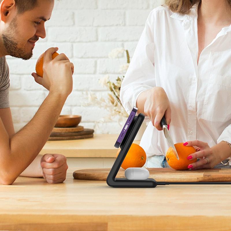 Lad iPhone og AirPods samtidig uten å måtte bruke flere kabler. De innebygde magnetene sørger for et perfekt feste og stabilt grep, noe som garanterer effektiv og sikker lading hver gang.