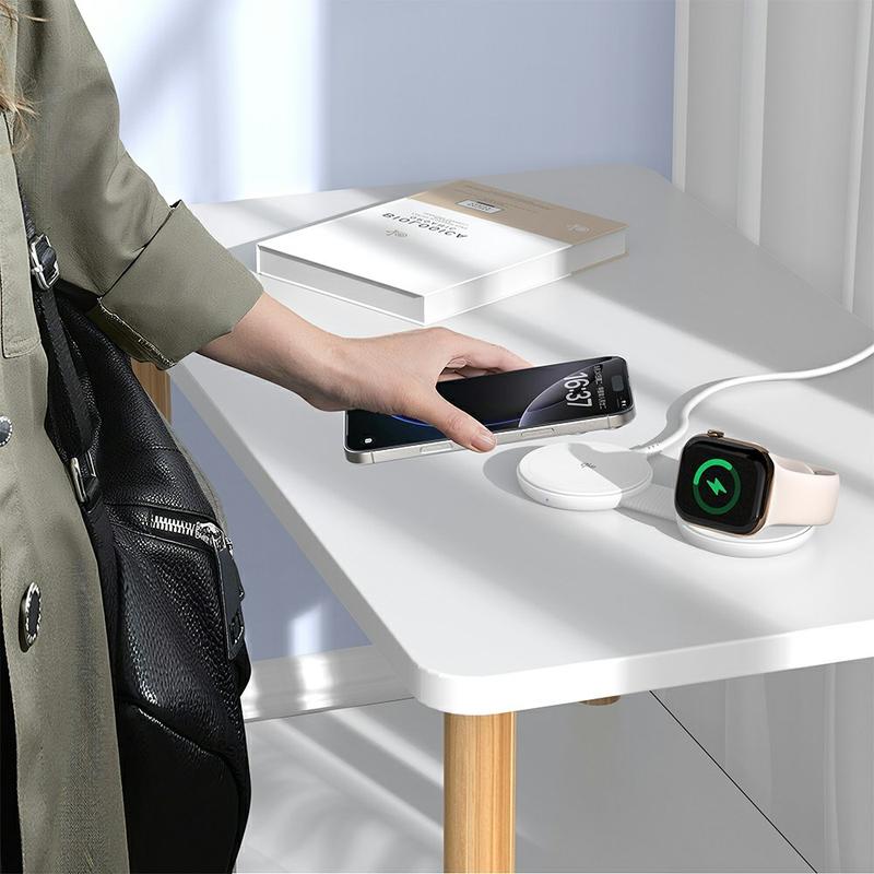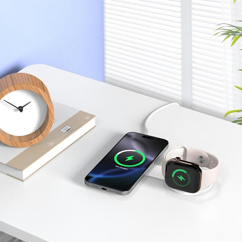 Støtter magnetiske iPhones, MagSafe-etuier, Apple Watch og de fleste Qi-kompatible ørepropper. En enkelt bærbar lader som forenkler behovet for lading av flere enheter.