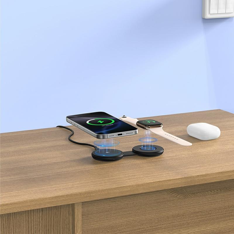 Støtter magnetiske iPhones, MagSafe-etuier, Apple Watch og de fleste Qi-kompatible ørepropper. En enkelt bærbar lader som forenkler behovet for lading av flere enheter.